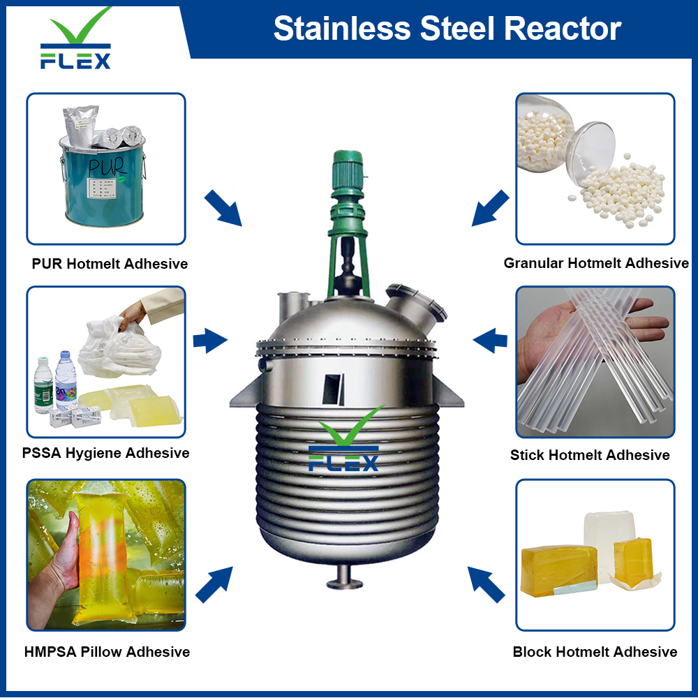 FLEX Machinery Co., Ltd. not only supplies customers with high-quality and cost-effective stainless steel reactor machine line, but also offers formula technical support, such as various adhesives: PSA pillow-shape hot melt adhesive, PUR hot melt adhesive, Block hot melt adhesive, EVA strip/granular hot melt adhesive, BOPP water-based adhesive, Grafted shoe adhesive , etc.